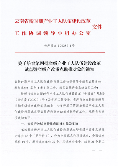 按照《云南省新時(shí)代產(chǎn)業(yè)工人隊(duì)伍建設(shè)改革“十四五”規(guī)劃》(云辦發(fā)[2022]1號(hào))及年度工作安排,云南省產(chǎn)改辦在持續(xù)推進(jìn)前三批省級(jí)試點(diǎn)建設(shè)的基礎(chǔ)上,于今年開(kāi)展了第四批省級(jí)產(chǎn)業(yè)工人隊(duì)伍建設(shè)改革試點(diǎn)暨省級(jí)產(chǎn)改重點(diǎn)助推對(duì)象培育工作。